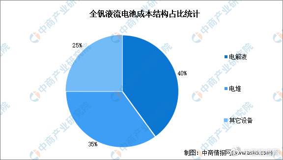 全钒液流电池成本结构主要分为电解液、电堆等,成本占比分别为40%、35%,其它设备占比25%。