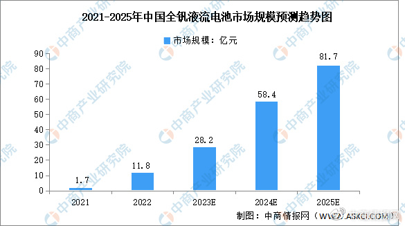 中商情报网讯:全钒液流电池的市场空间主要来自于储能需求的增长以及自身渗透率的提升,随着技术的进步及生产成本的降低,全钒液流电池市场空间将逐步扩大。数据显示,2022年全钒液流电池市场规模约11.8亿元,预计2025年我国全钒液流电池市场规模将增至81.7亿元,2021-2025年复合年均增长率达163.3%。