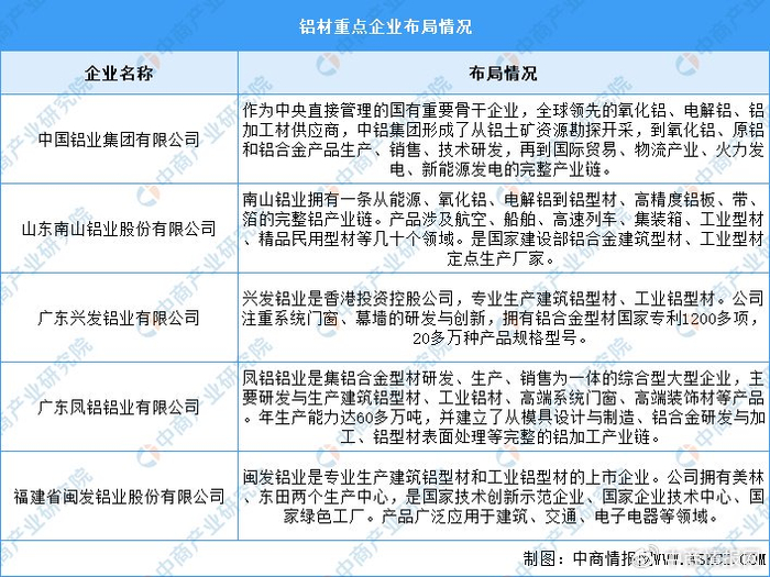 中国铝材企业规模庞大,结构多元。从规模上看,中国铝材行业已经形成了巨大的生产能力和产能,总体产能达到5900多万吨,占据全球铝材行业总产能的较大份额。重点企业包括中国铝业集团有限公司、山东南山铝业股份有限公司、广东兴发铝业有限公司,具体如图所示: