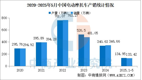 中商情报网讯:5月,全行业完成电动摩托车产销26.15万辆和26.72万辆,产量环比下降5.65%,销量环比增长0.45%,同比下降14.88%和19.33%。1-5月,全行业完成电动摩托车产销134.95万辆和133.42万辆,产量环比下降5.65%,销量环比增长0.45%。
