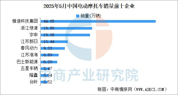 1-5月,电动摩托车销售前十名企业(集团)为雅迪科技集团、浙江绿源、宗申、江苏新日、春风动力、江苏淮海、巴士新能源、五星车辆、隆鑫、台铃分别销售44.65万辆、19.89万辆、19.08万辆、10.44万辆、9.33万辆、6.89万、6.29万辆、3.47万辆、3.04万辆和2.52万辆。