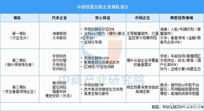 中国智能安防行业呈现明显的梯队格局。第一梯队包括海康威视、大华股份等龙头企业,占据市场主导地位。第二梯队包括宇视科技、华为好望、天地伟业、苏州科达等企业,注册资本在4-25亿元之间,具有较强的市场竞争力。第三梯队为其他中小企业,数量众多,但市场份额相对较小。