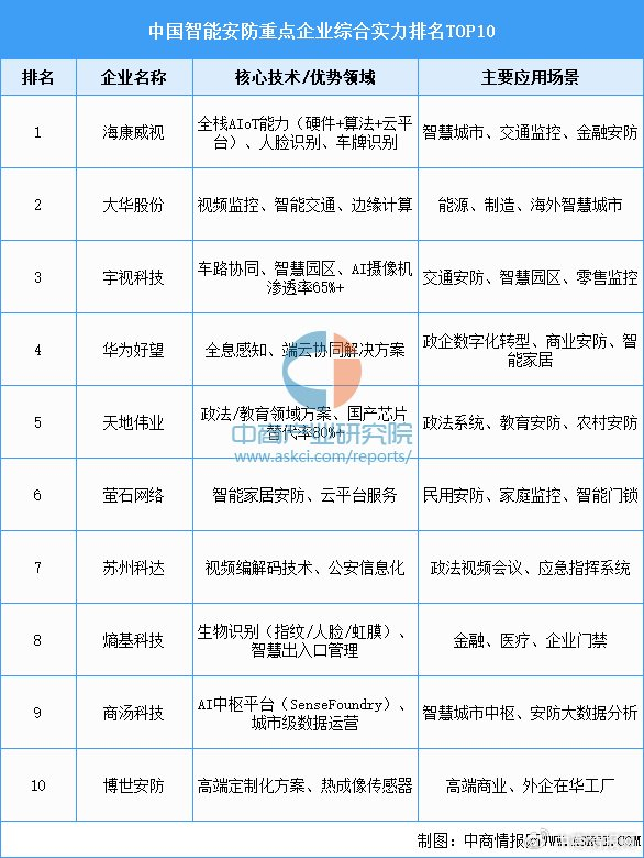 根据技术实力、市场份额、产品覆盖度及行业影响力等维度排名,中国智能安防重点企业综合实力TOP10企业包括海康威视、大华股份、宇视科技、华为好望、天地伟业等。