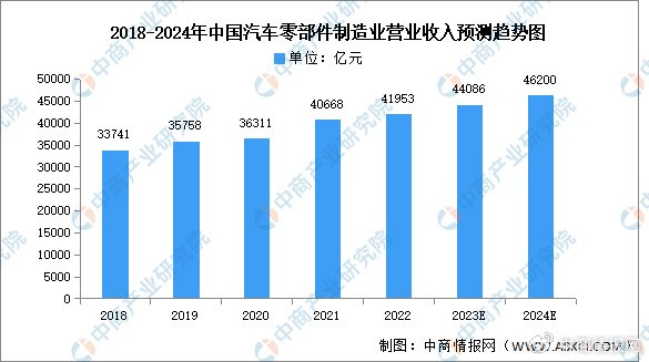 中商情报网讯:随着国内汽车零部件制造水平不断提升以及新能源汽车的发展,汽车零部件行业也得到了快速发展。中商产业研究院发布的《2023-2028年中国汽车零部件产业发展趋势及投资风险研究报告》显示,2022年汽车零部件制造业营收约为41953亿元,同比增长3.16%。中商产业研究院分析师预测,2023年汽车零部件制造业营收将进一步增长至44086亿元,2024年将达46200亿元。