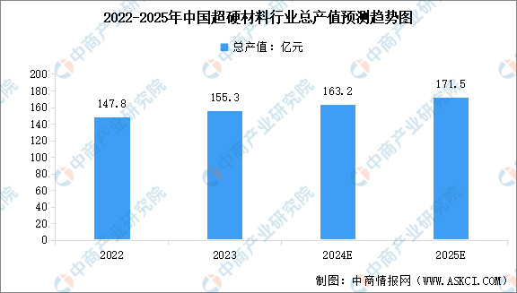 经过六十年的磨砺和沉淀,中国超硬材料行业实现从无到有、由弱渐强的巨大转变,超硬材料及制品已经成为国家各项支柱产业解决关键共性技术、实现新一代技术创新的重要支撑点。当前,我国超硬材料产业在全球市场中处于主导地位。中商产业研究院发布的《2025-2030年中国超硬材料深度分析及投资前景研究预测报告》显示,2023年中国超硬材料行业总产值达155.3亿元,较上年增长5.07%。中商产业研究院分析师预测,2024年中国超硬材料行业总产值将达到163.2亿元,2025年达到171.5亿元。
