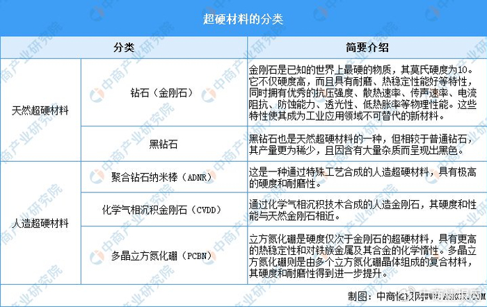超硬材料是指硬度特别高的材料,通常其维氏硬度值超过40GPa。超硬材料可以分为天然超硬材料和人造超硬材料两大类,天然超硬材料主要包括金刚石(钻石)和黑钻石,而人造超硬材料则包括聚合钻石纳米棒(ADNR)、化学气相沉积金刚石(CVDD)以及多晶立方氮化硼(PCBN)等。