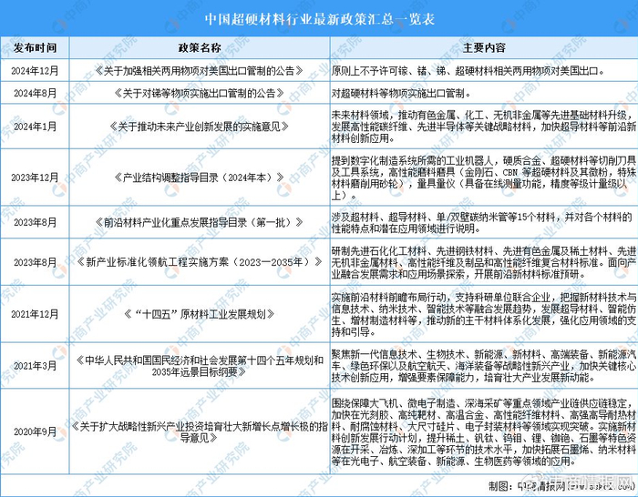 超硬材料被誉为“工业的牙齿”,是支撑国民经济建设和发展的重要基石。近年来,我国政府相关部门高度重视超硬材料行业发展,围绕出口管制、产业发展引导等方面,相继出台了《关于加强相关两用物项对美国出口管制的公告》、《关于对锑等物项实施出口管制的公告》等一系列出口管制措施,以及《关于推动未来产业创新发展的实施意见》、《产业结构调整指导目录(2024年本)》等产业发展引导政策,旨在全方位支持并引导超硬材料行业的持续健康发展。