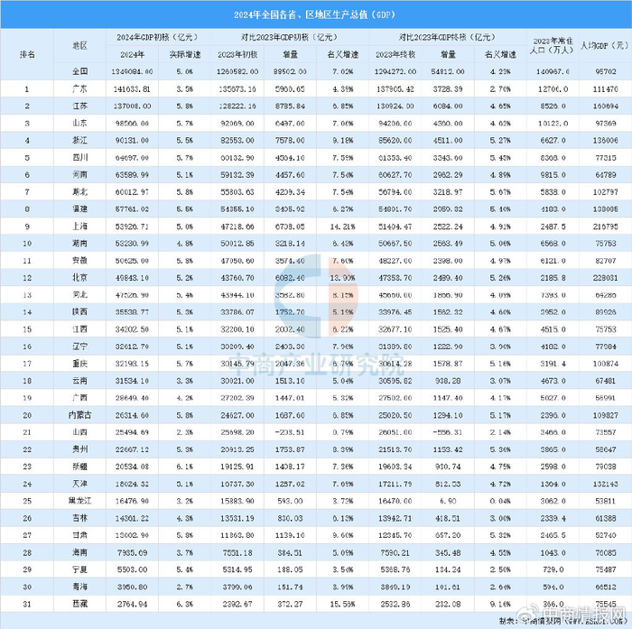 中商情报网讯:近日,2024年各省、区生产总值相继出炉。2024年全国GDP初核数据为1349084亿元,实际增速5%,全国共有22个省份实际增速大于或等于5%。广东省GDP总量超14万亿元,排名第一。江苏紧随其后,达到13.7万亿元。山东、浙江和四川分别位列第三至第五,GDP分别为9.86万亿、9.01万亿和6.56万亿。从增速来看,新疆和西藏分别以6.1%和6.3%的增速成为经济发展的黑马。整体来看,中国经济呈现大省稳中向好、区域经济差异显著的特点。