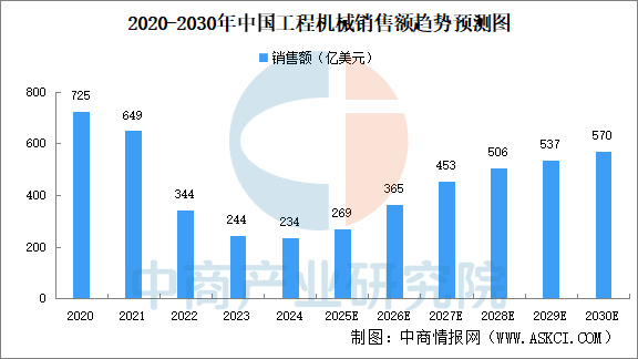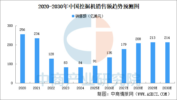 数据来源:弗若斯特沙利文、中商产业研究院整理作为中国工程机械行业最大的单一核心细分市场,挖掘机市场的表现直接影响行业整体走势。中商产业研究院发布的《2025-2030全球及中国挖掘机行业深度研究报告》显示,2020年至2023年,受市场周期波动影响,挖掘机销售额从2020年的256亿美元急剧下降至2023年的83亿美元,2024年起,挖掘机市场逐步回暖,2024年销售额达到84亿美元。中商产业研究院分析师预测,2025年中国挖掘机销售额将达91亿美元,2030年销售额将达214亿美元。