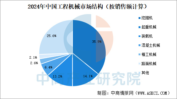 中国工程机械销售市场主要以挖掘机、起重机械、装载机为主。2024年中国挖掘机、起重机械、装载机销售额占比分别为35.9%、14.1%、13.2%。混凝土机械、椿工机械、路面机械销售额占比分别为6.4%、2.6%、2.1%。