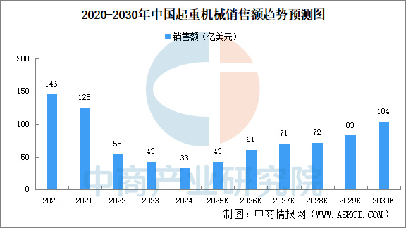 中商产业研究院发布的《2025-2030年中国工程机械市场需求预测及发展趋势前瞻报告》显示,起重机械市场受新能源(风电)、港口物流等行业需求增长推动,2024年市场规模为33亿美元,2030年预计增长至104亿美元,2024年至2030年复合年增长率为21.2%,成为增长最快的细分市场之一。风电行业的高速发展以及港口物流的智能化升级是主要驱动力。