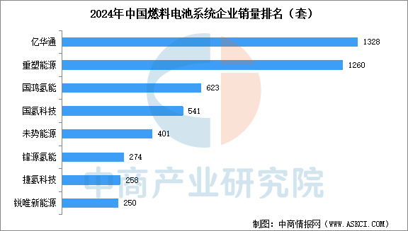 2024年,中国约有60家企业系统出货。亿华通燃料电池系统销量为1328套,占领先地位,市占率为18.7%;重塑能源销量1260套,位列第二,市占率17.8%;国鸿氢能销量623套,位列第三,市占率8.8%;第四是国氢科技销量541套,市占率为7.6%。Top5系统企业占比58.5%。