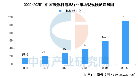 中商情报网讯:随着政策落地和技术突破,氢燃料电池有望在交通、工业、能源等领域实现规模化应用,助力碳中和目标实现。中商产业研究院发布的《2025-2030年中国氢燃料电池市场调查与投资机会前景专题研究报告》显示,2020-2024年中国氢燃料电池行业市场规模从15亿元增长至59.9亿元,期内年均复合增长率达41.36%。中商产业研究院分析师预测,2025年中国氢燃料电池市场规模将达到110.8亿元。