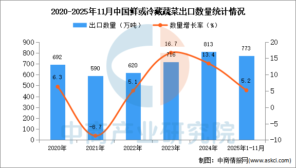 中商情报网讯:据中商产业研究院数据库显示,2024年我国鲜或冷藏蔬菜的出口量813万吨,同比增长13.4%。最新数据显示,2025年1-11月中国鲜或冷藏蔬菜出口量773万吨,同比增长5.2%。