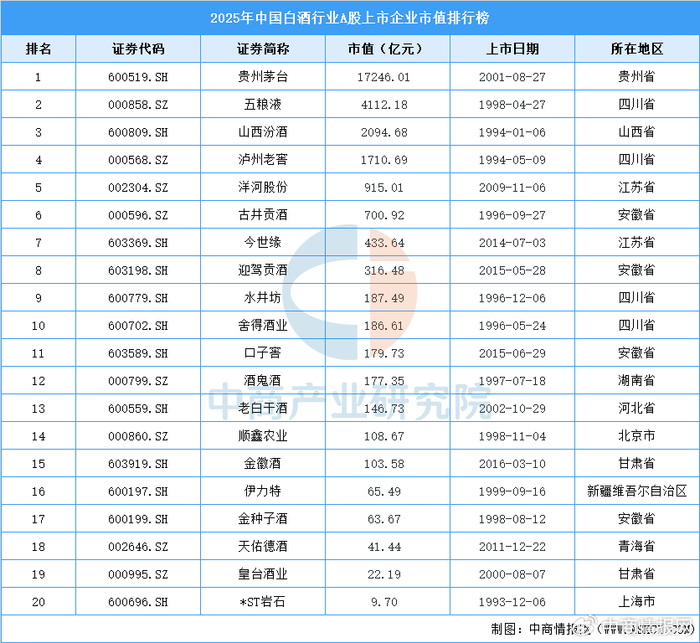 中商情报网讯:中商产业研究院数据库显示,截止到2025年12月31日,A股白酒行业共20家上市公司,总市值达28822.28亿元。4家上市公司市值超千亿,1家上市公司市值超万亿。