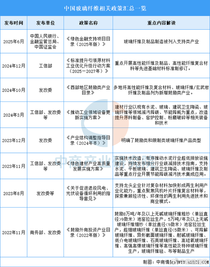 中商情报网讯:国家陆续出台了多项政策,鼓励玻璃纤维行业发展与创新,《标准提升引领原材料工业优化升级行动方案(2025—2027年)》《西部地区鼓励类产业目录》《推动工业领域设备更新实施方案》等产业政策为玻璃纤维行业的发展提供了明确、广阔的市场前景,为企业提供了良好的生产经营环境。具体情况列示如下: