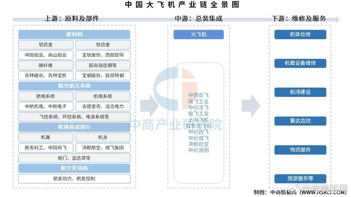 中国大飞机产业链上游为原料及部件,包括原材料、航空发动机、航空航天系统、机体组成部分;中游为大飞机总装集成;下游为维修及服务,包括机体检修、机载设备维修、机场建设、雷达监控、物流服务、旅游服务等。