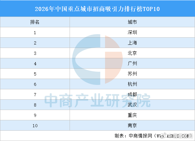 中商情报网讯:近日,国内权威产业研究机构中商产业研究院正式发布《2026年中国重点城市招商吸引力排名报告》,本次排名基于2025年全年招商运营数据,从实际利用外资、重大项目落地、总部企业增量、专精特新企业引入、政策吸引力、产业配套完善度6大维度18项细分指标,对全国50个重点城市进行综合评估,最终形成权威排名。