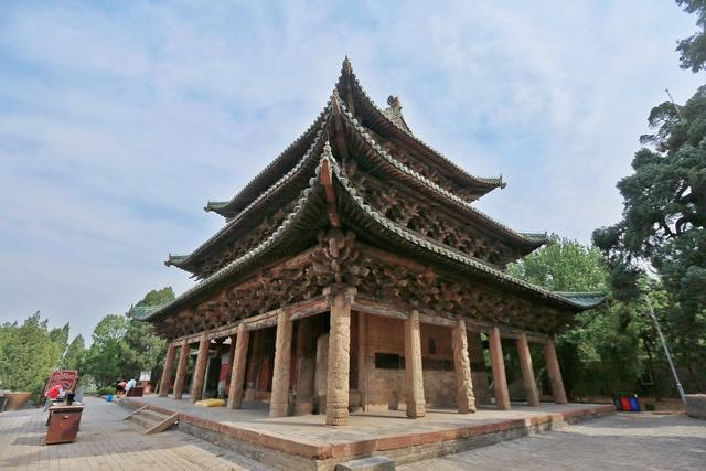 大罗三境殿后是同样有着年岁的玉皇阁,阁楼为明代建造,高约20米,是河南目前现存最高大的古阁。三层飞檐斗拱已足够让人赞叹,更夺人眼球的是支撑阁楼的20根石柱,同样雕工精湛,神话传说,花草鱼虫,民间故事等都在其上,内容十分丰富。