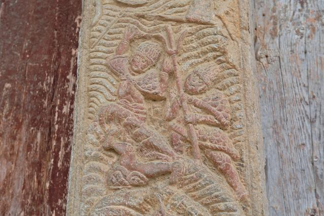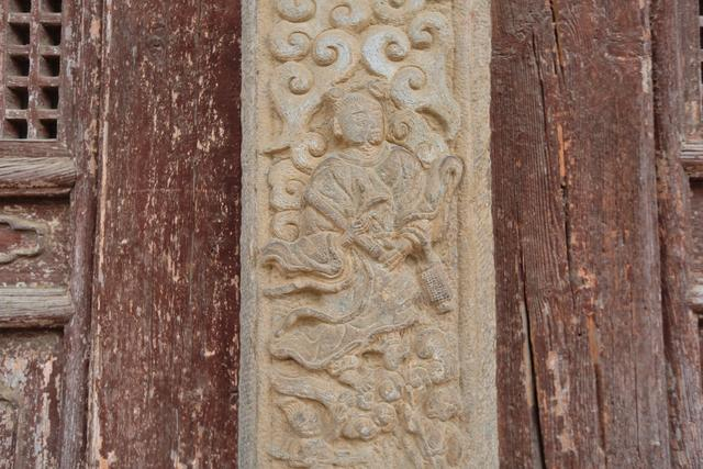 殿门两侧的四根石立柱以画代字,用石雕画作对联,寄托着希冀风调雨顺、国泰民安的美好愿望。