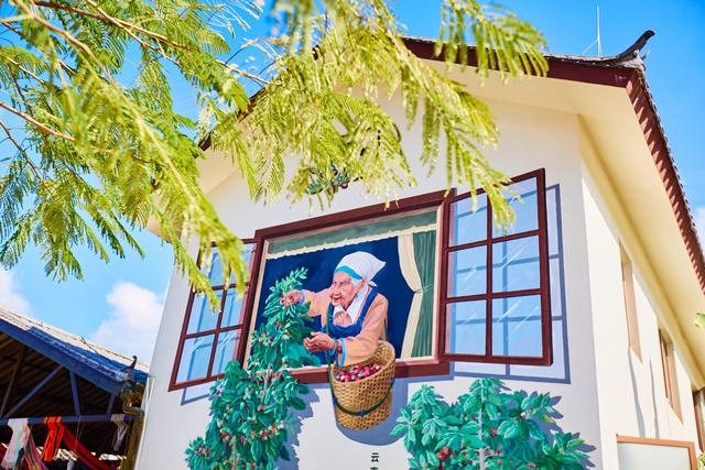 走进村子,咖啡文化元素随处可见,3D墙绘栩栩如生,老人手捧咖啡果的场景正是当地咖农的生活日常。