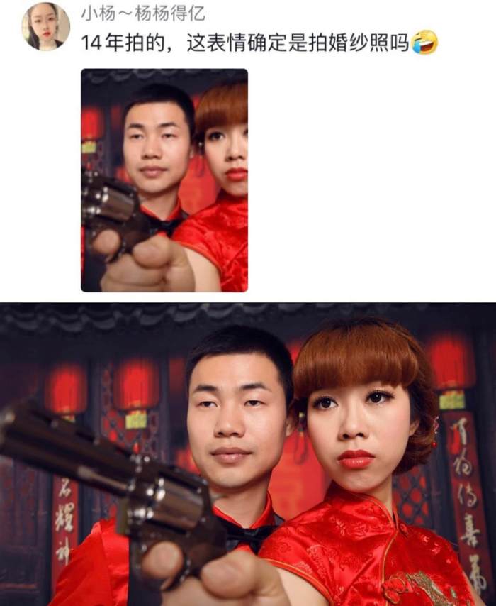 这坚定的表情,凝重的神态,无一不在象征一对新人坚定的决心:要用革命的心态,将爱情进行下去。