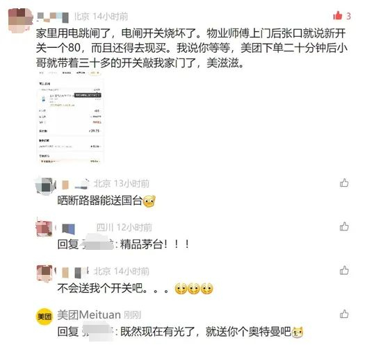 因此,当有人晒出电闸开关坏了后,第一天晒断路器的老哥立马重返“犯罪现场”,热心肠地告诉新同学”晒断路器能送茅台”。