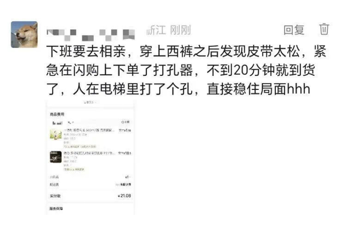 想回家去换一条,时间已经来不及了,情急之下闪购了一把打孔器,现场在腰带上扎出一个新孔,才解决了燃眉之急。