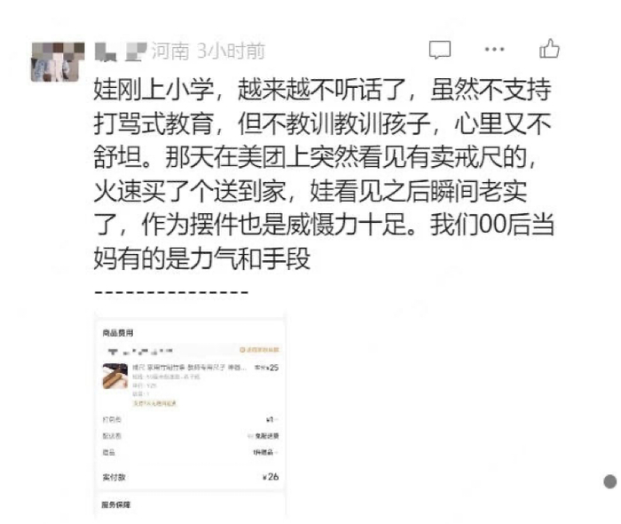 孩子也没想到,上一分钟还在嘴硬顶嘴的老妈,不到30分钟手里就能凭空变出一把新买的戒尺。虽然没真动手,却靠这一波天降道具,“打”自己了一个措手不及。