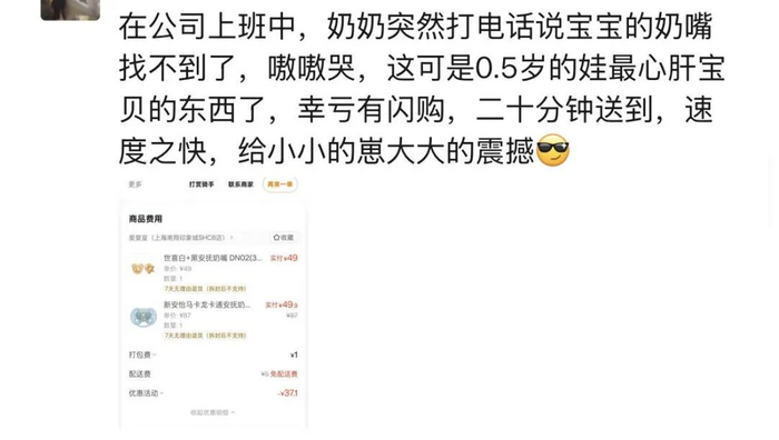 有人家里突然断电,本以为是跳闸,一查才发现是断路器烧了,闪购火速下单补货,屋里才能重见光明;有人家里小孩哭着闹着,说明天上课老师要用七巧板,实际是想拥有同桌同款豪华玩具,家长心里再明白,也得连夜闪购安排上。