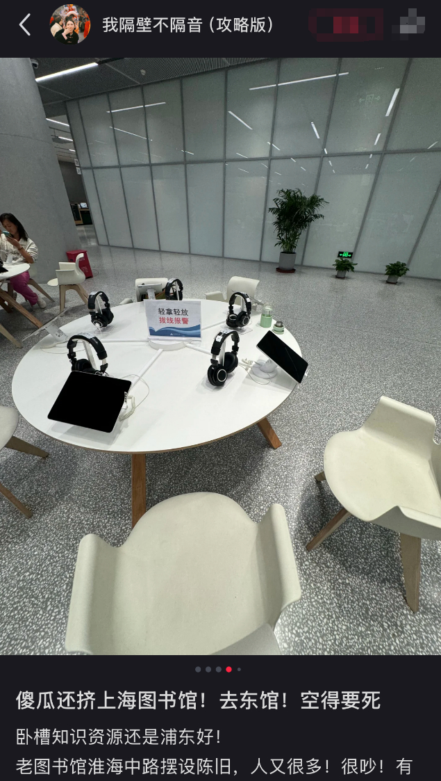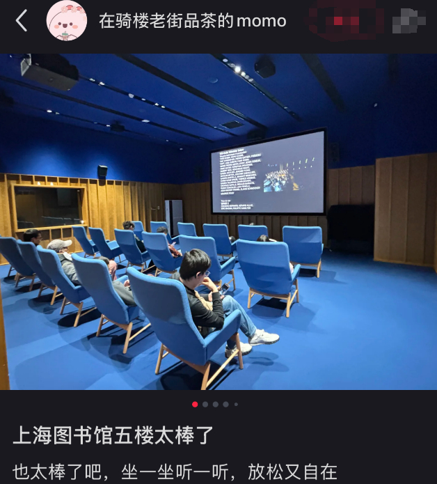 “比如浦东图书馆,内部空间就像是一个文艺版的洗浴中心。只不过把电竞房换成了摆满电脑的数字阅读中心,把KTV换成了隔音朗读室。棋牌区也被升级成了智能体验区,可以让象棋机器人陪你杀个昏天暗地。这里的服务甚至比咖啡馆还贴心,随便一个沙发椅上都贴心预留了充电口,让人能舒舒坦坦待上一整天。”