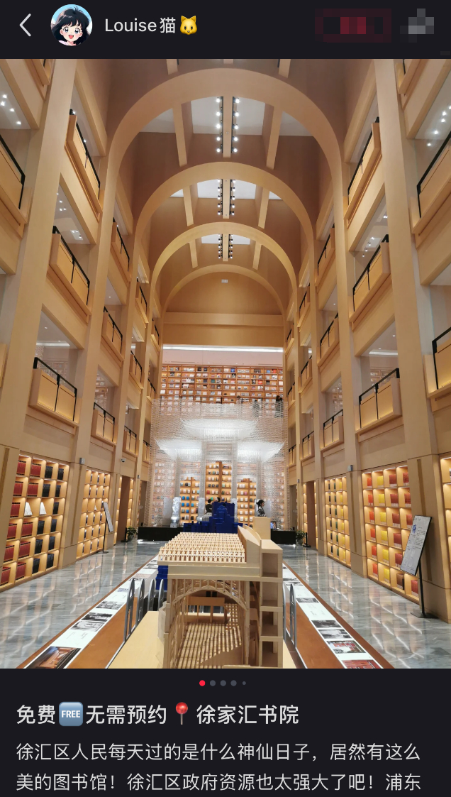 有人还把上海的图书馆,玩成了不用花一分钱的迪士尼乐园。家住徐汇的沪漂xixi,家附近就是徐家汇书院。“水晶灯、阁楼、玻璃雕塑,里面装修得简直像是卢浮宫。在小某书上,徐家汇书院甚至有属于自己的网红机位,周末不乏有都市丽人前来打卡。”