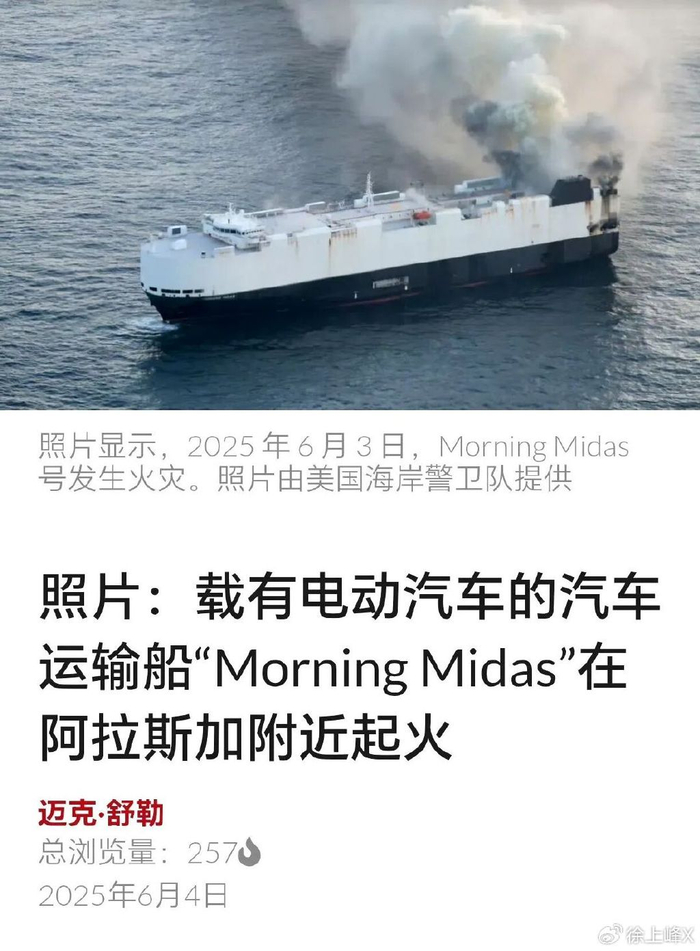 新能源汽车最怕燃烧,救援难度太大。新能源汽车如果在停车场燃烧,周边的几辆车通常会遭殃,一起葬身火海。当然,最可怕的是,出口的新能源汽车在运输过程中燃烧,几千辆车挤在一起,基本无法救援。这不,最近,一辆运输3000辆汽车(含700多辆新能源汽车)的巨轮,在太平洋中着火了。