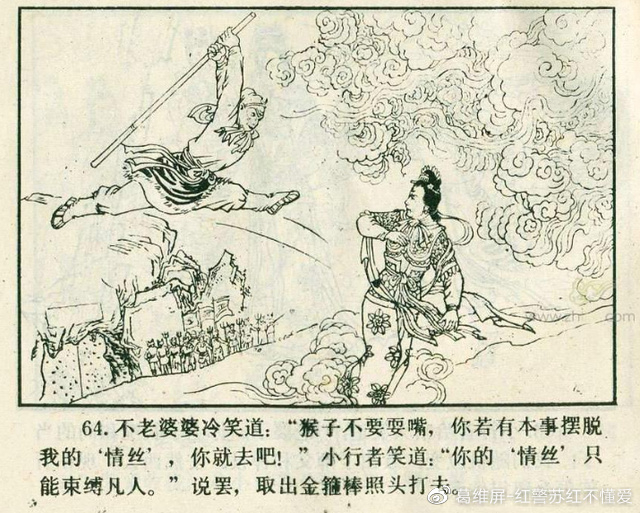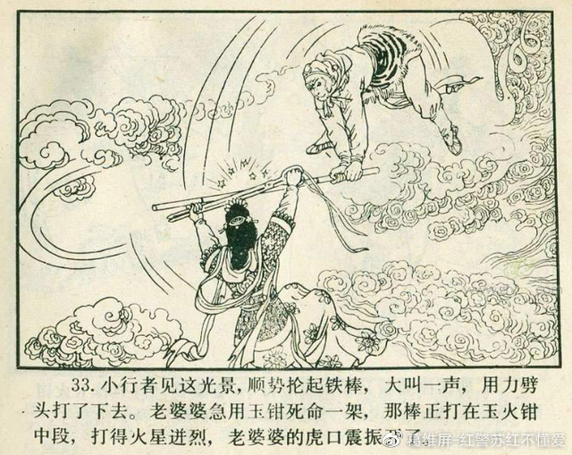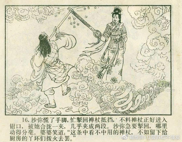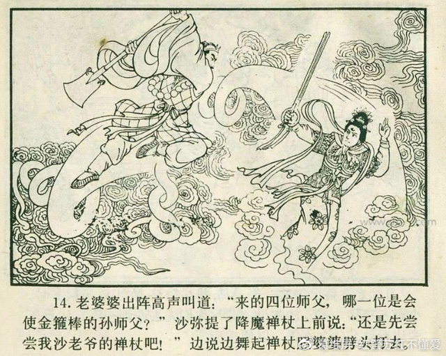 这一个段落的故事也不算复杂,孙小圣一行来到了“不老婆婆”的所在处,这个“不老婆婆”有一点近似于金庸小说《天龙八部》里的天山童姥,虽然年龄不小,但看起来颇为童颜,不过这个“不老婆婆”有一个怪僻,喜欢舞枪弄棒,自恃有一个神器,专等旗鼓相当的对手,对垒交手,才会觉得满心畅快。