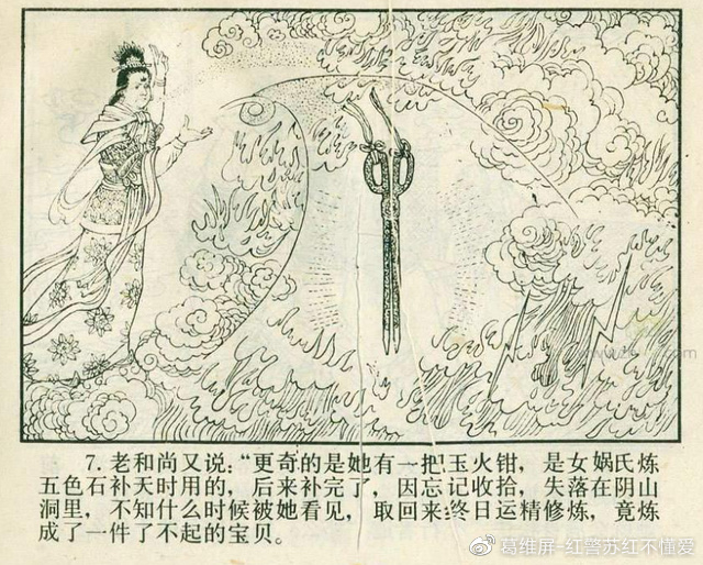 孙小圣走到“不老婆婆”所在山头,听闻当地的一个和尚介绍到“不老婆婆”拥有一个颇有来历的“玉火钳”,说这个玉火钳,原来是“女娲氏炼五色石补天时炉火中的。后来天补完了,因这钳火气不消,就放在山腰背阴处晾冷,因忘记收拾,遂失落在阴山洞里。不知几时,被她找着了,取回来,终日运精修炼,竟炼成一件贴身着肉的至宝。若遇见一个会使枪棒的好汉与她对敌一番,便觉香汗津津,满身松快。故这婆婆每日只想着寻人对敌取乐。”