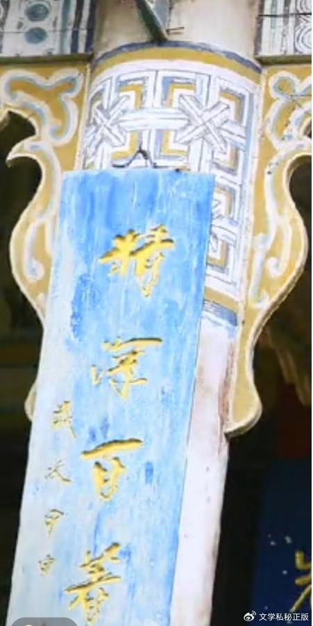 出来的时候,门上的一副对联让沈巍卡了壳,此联用草书书写,下联“开百年文教”,但上联五个字,就难以认清楚了,沈巍直称“就不知道了”,暂时搁在一边,然后直奔大殿,外檐上的对联,写在蓝色底字上,但字迹暗淡,识别起来不容易,好在字体是楷体,还算好认: