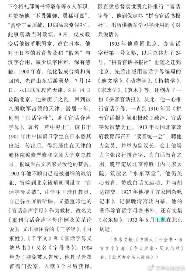 ——王照(1859—1933):直隶宁河(今属天津)人,字小航,号水东,别署芦中穷士。光绪进士,由庶吉士改授礼部主事。光绪二十四年(1898)百日维新期间,上疏清光绪帝游历日本等国,遭礼部尚书怀塔布、许应骥等守旧派阻挠。光绪帝旋下诏将礼部六堂官革职,赏赐他三品顶戴,以四品京堂候补,用昭激励。戊戌政变后,被革职通缉,流亡日本,曾参与孙中山、康有为两派谋联合的谈判。后潜心研究汉语拼音字母,拟订“官话字母”,一度流行于北方各省。三十一年创办拼音官话书报社。1913年任读音统一会副会长。晚年持“教育救国”主张。著有《水东集》、《小航文存》。——