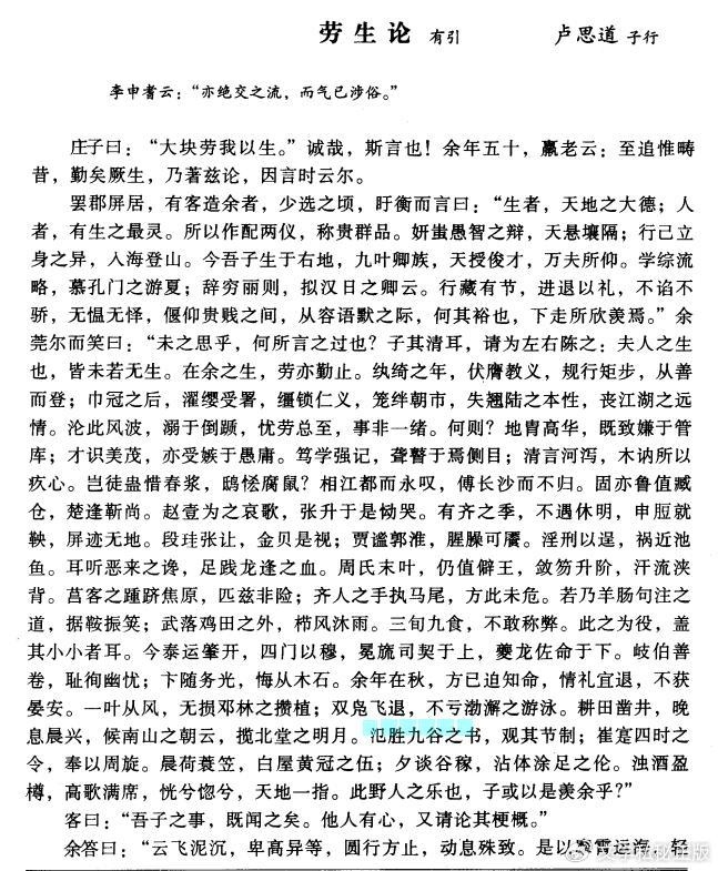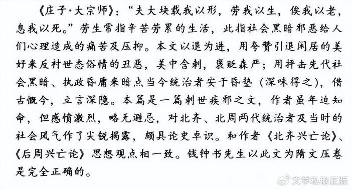 ——《庄子·大宗师》:“夫大块载我以形,劳我以生,俟我以老,息我以死。”劳生常指辛苦劳累的生活,此指社会黑暗邪恶给人们心理造成的痛苦及压抑。本文以退为进,用夸赞引退闲居的美好来反衬世态俗情的丑恶,美中含刺,褒贬森严;用抨击先代社会黑暗、执政昏庸来暗点当今统治者安于昏垫(深味得之),借古慨今,立言深隐。本篇是一篇刺世疾邪之文,作者虽年迫知命,但感愤激烈,略无避忌,对北齐、北周两代统治者及当时的社会风气作了尖锐揭露,颇具论史卓识。和作者