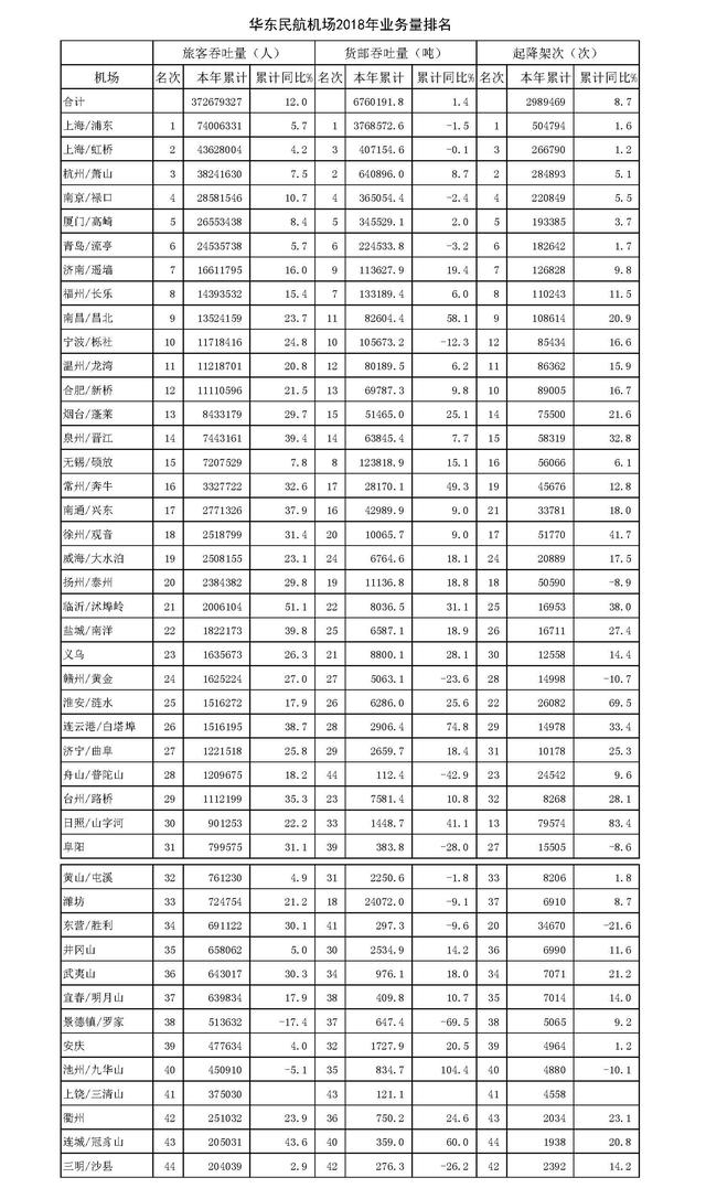 2018年华东地区44个机场累计完成: