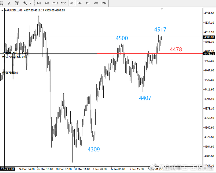 国际黄金的小时图走势直接把多空博弈拉满了!从4550暴跌到4273,再反弹到4517,现在卡在4509附近震荡,而4478这个位置,就是接下来黄金走势的生死线!