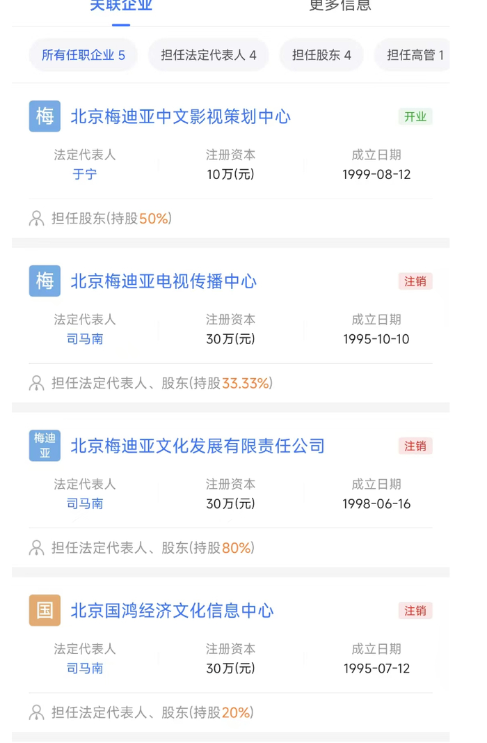 极速财讯发现,司马南的商业版图以流量为核心,涵盖自媒体广告、品牌代言及关联企业。爱企查APP显示,司马南担任北京梅迪亚电视传播中心、北京梅迪亚文化发展有限责任公司、北京国鸿经济文化信息中心等公司法定代表人,担任北京梅迪亚中文影视策划中心、北京梅迪亚电视传播中心、北京梅迪亚文化发展有限责任公司等公司股东,担任北京梅迪亚文化发展有限责任公司等公司高管。业务主要涉及租赁和商务服务业。