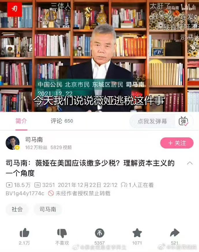 2021年12月,司马南就薇娅逃税一事进行评论。他表示,这种逃税行为十分恶劣,已经不仅仅是道德问题了。随后,他以此延伸解读,并以美国富人缴税纳税为例称‘越有钱越不纳税、少纳税’,最终说明美国一些富豪有逃税的手段。此次司马南却陷入了偷税风波。