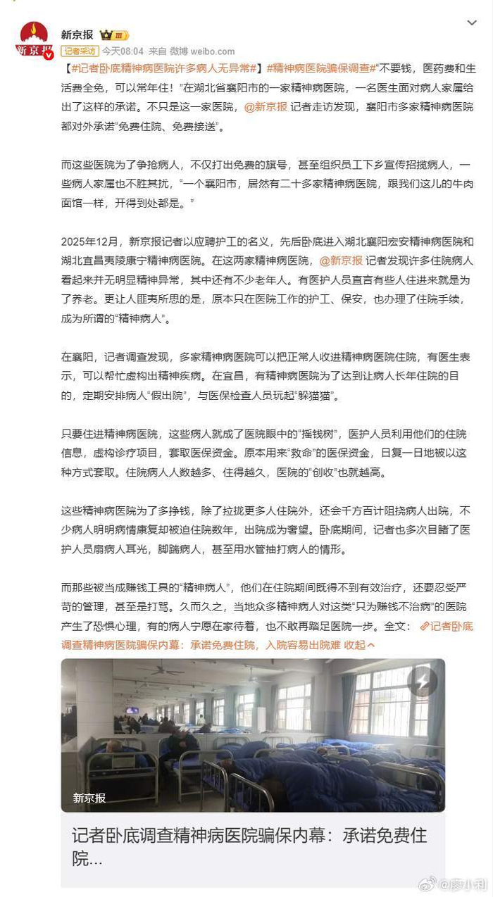 这个比贪污腐败更可恶更可怕,这已经不是简单的骗保,而是对弱势群体的系统性伤害。希望有关部门能以此为契机,彻底整顿这类精神病医院的乱象,别让医保基金成为黑心商家的唐僧肉。