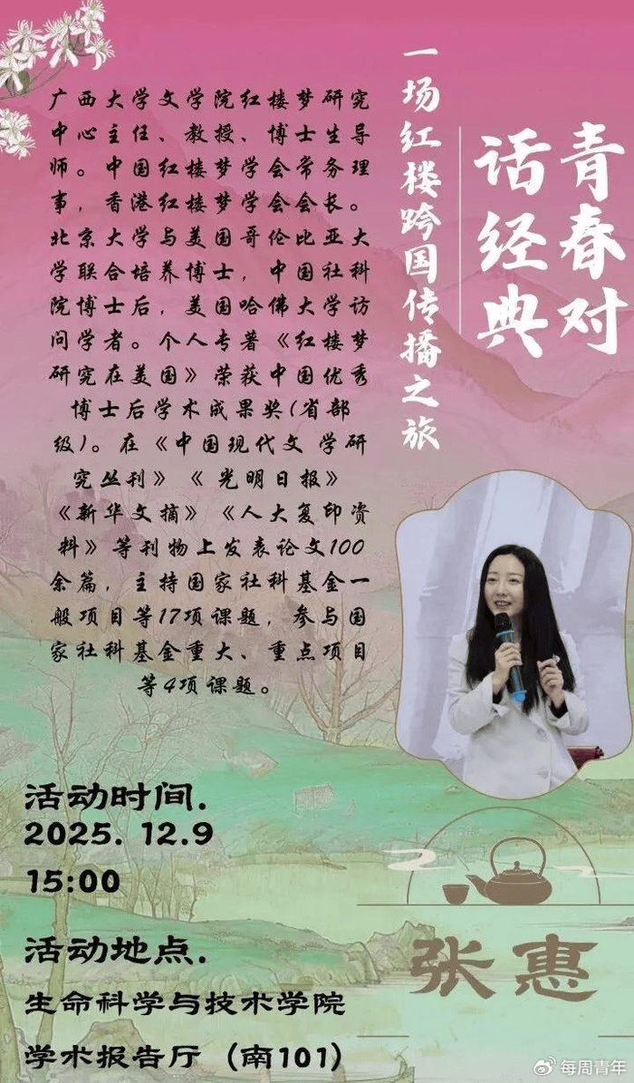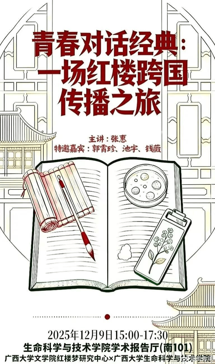 自2025年11月18日的第一场“古典×青春”沙龙起,广西大学红楼梦研究中心“梦广红楼”系列文化活动便开启了一场连续两个月的文化探索之旅。2025年12月9日,这场系列探索迎来了它的第四篇章,也是收官之作:“青春对话经典:一场跨国的‘红楼’之旅”。与前三期聚焦点不同,本期将目光投向了更辽阔的远方——当《红楼梦》跨越国界,它如何在异域文化中生根发芽?当日下午,广西大学文学院红楼梦研究中心与广西大学生命科学与技术学院联合举办的“青春对话经典:一场‘红楼’跨国传播之旅”思想荟,在古琴清音中缓缓启幕。