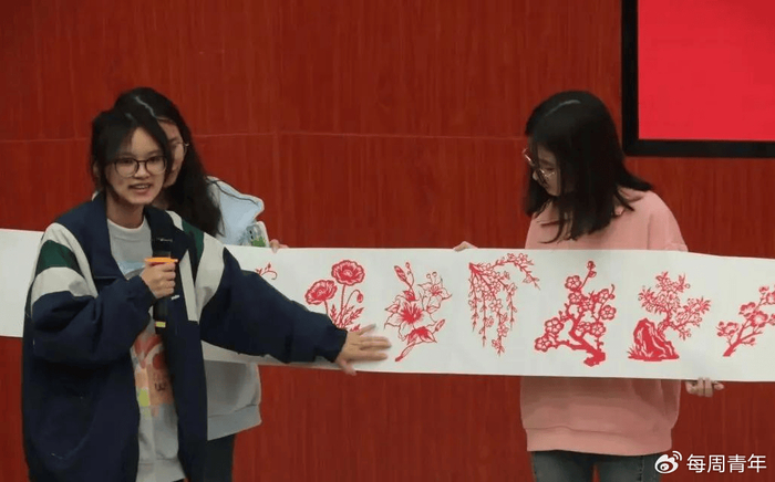 红楼梦中画:传统剪纸艺术勾勒金陵十二钗的灵动身姿。同学们在长卷上精心剪刻,宝钗的牡丹、湘云的海棠……每个人物都与本命花神相映成趣。剪刀游走间,不仅再现了古典人物的神韵,更让传统剪纸技艺在当代校园中焕发新生。