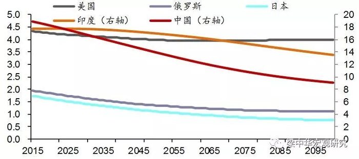 随着我国总人口增速放缓甚至出现负增长,印度将逐渐超过中国成为全球第一人口大国。根据联合国的预测,印度有望在5年后的2024年超过中国。我国人口数量在全球的占比也将逐步下降,从接近20%左右,逐渐降至本世纪末的10%以下。当然这个预测还很遥远,几十年间还有很多政策会调整,真实结果可能和预测偏差很远,但我国人口占比下降的趋势已经开始。
