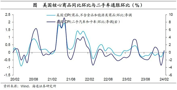 往前看,核心通胀下行难度加大。一方面,核心商品通胀下行停滞。2月核心商品通胀同比为-0.3%,与1月持平;商品通胀环比转正至0.4%,核心商品通胀环比也转正至0.1%,为2023年5月以来首次。这主要与二手车价格回升有关,其环比由1月的-3.4%转正至0.5%;同比跌幅也收窄至1.8%。此外,除二手车外的核心商品通胀环比也保持在0.1%。