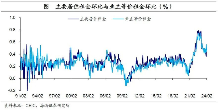 其中,最主要的因素仍是租金通胀。2月主要居住租金和业主等价租金同比和环比继续回落,但依然处于相对较高水平。此外,除租金外的核心服务通胀也在持续上行。