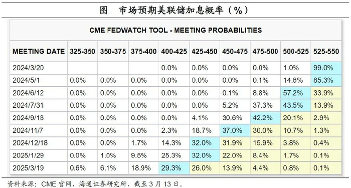 根据CME观察显示,截至3月13日,市场预期美联储大概率将在6月降息;预期全年有4次左右的降息可能,相比通胀数据公布前变化不大。