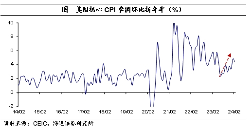 核心通胀小幅下行。核心CPI同比为3.8%,较1月下行0.1个百分点,为2021年5月以来低点;核心CPI季调环比为0.4%,与1月持平。此外,2月核心CPI季调环比折年率小幅回落至4.4%,但仍较高。核心通胀下行依然缓慢,道路仍较为曲折。